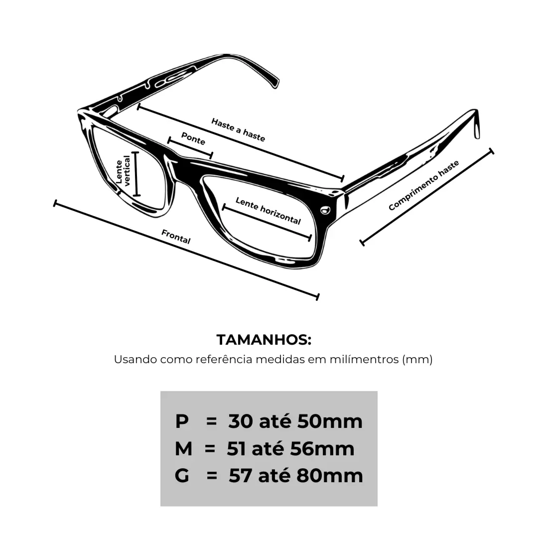 O óculos é fabricado em Acetato na cor Marrom Brilho, com hastes na cor Azul.